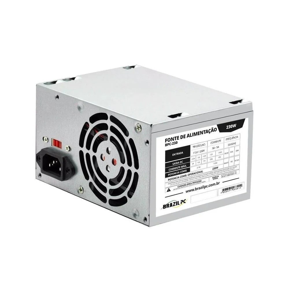 Fonte de Alimentação para PC GET A-230 Com a fonte de alimentação GET A-230, você pode garantir a corrente contínua e estável de seu computador desktop e otimizar o funcionamento de seus componentes. Através de seu sistema de refrigeração, você poderá manter a temperatura ideal de seus componentes e evitar o superaquecimento. Principais características: – Marca: Dmix / Dex – Modelo:GET A-230 – Potência 230w – Bivolt (chaveamento manual) – Eficiência > 70% – MTBF de 100.000 horas a 25°C – Proteção contra curto circuito OVP / OCP / SCP – Chaveamento manual 110 / 220V – Ventilador de 80 mm ultra silencioso – Acompanha Cabo de Força (110cm de comprimento) – Normas técnicas IEC60950 (segurança elétrica) e IEC61000 (segurança eletromagnética) Conectores: – 1 conector ATX 20+4 pinos – 1 conector ATX 12V – 2 conectores SATA – 2 conectores IDE Dimensões: – Altura: 8,5 cm – Largura: 15 cm – Profundidade: 14 cm – Peso: 740 g